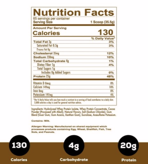 پروتئین وی ایزوله هیدرولیزه، کنستانتره پروتئین وی، پودر کاکائو، طعم دهندههای طبیعی، نمک، صمغ، ساکرالوز، پتاسیم